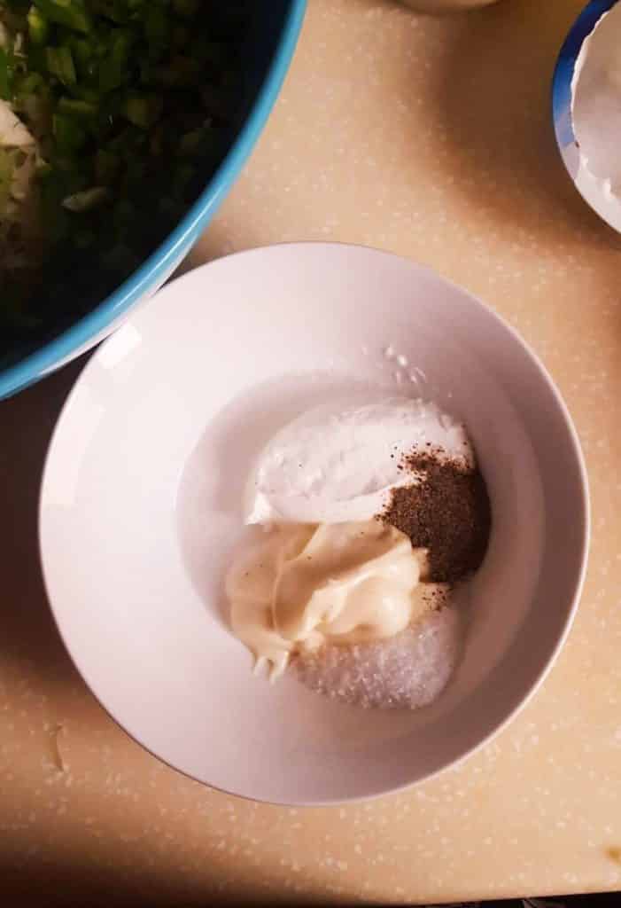 - Mix sugar, black pepper powder, vinegar, cream and mayonnaise together in a bowl